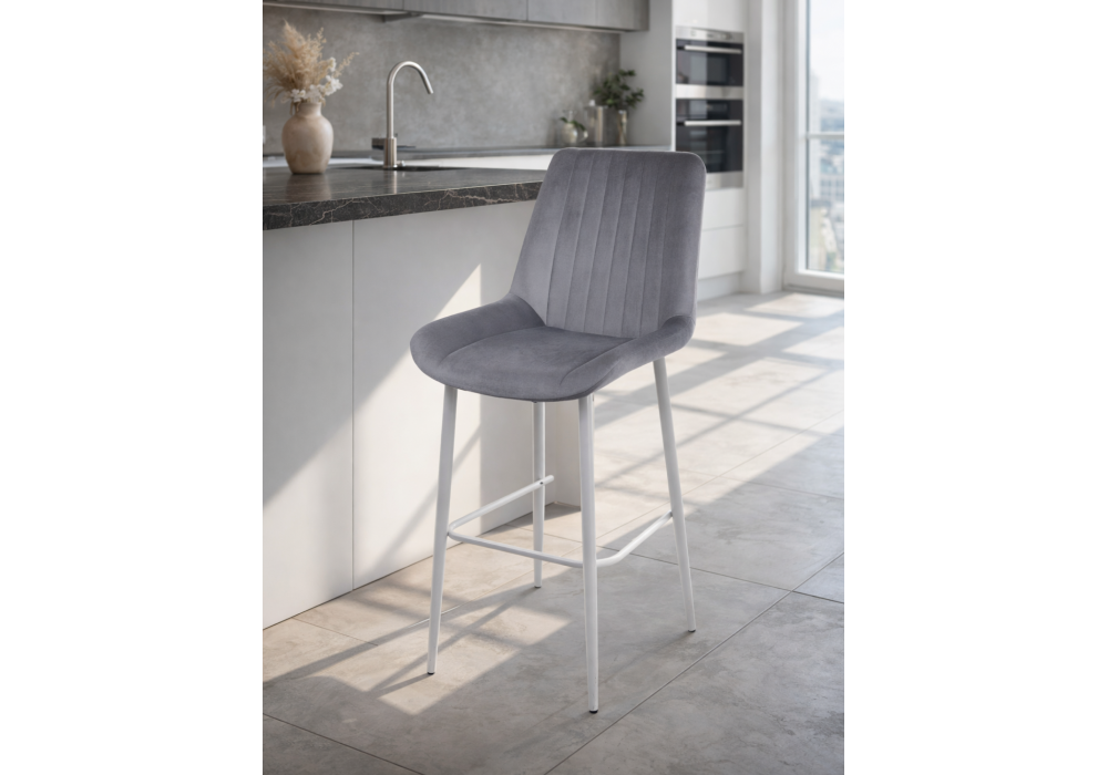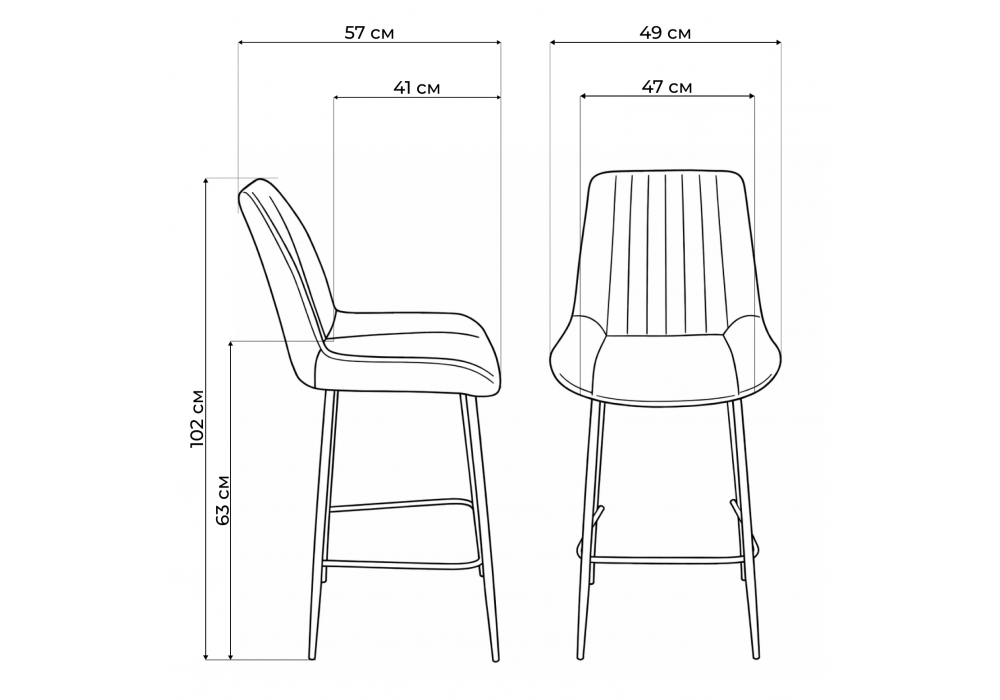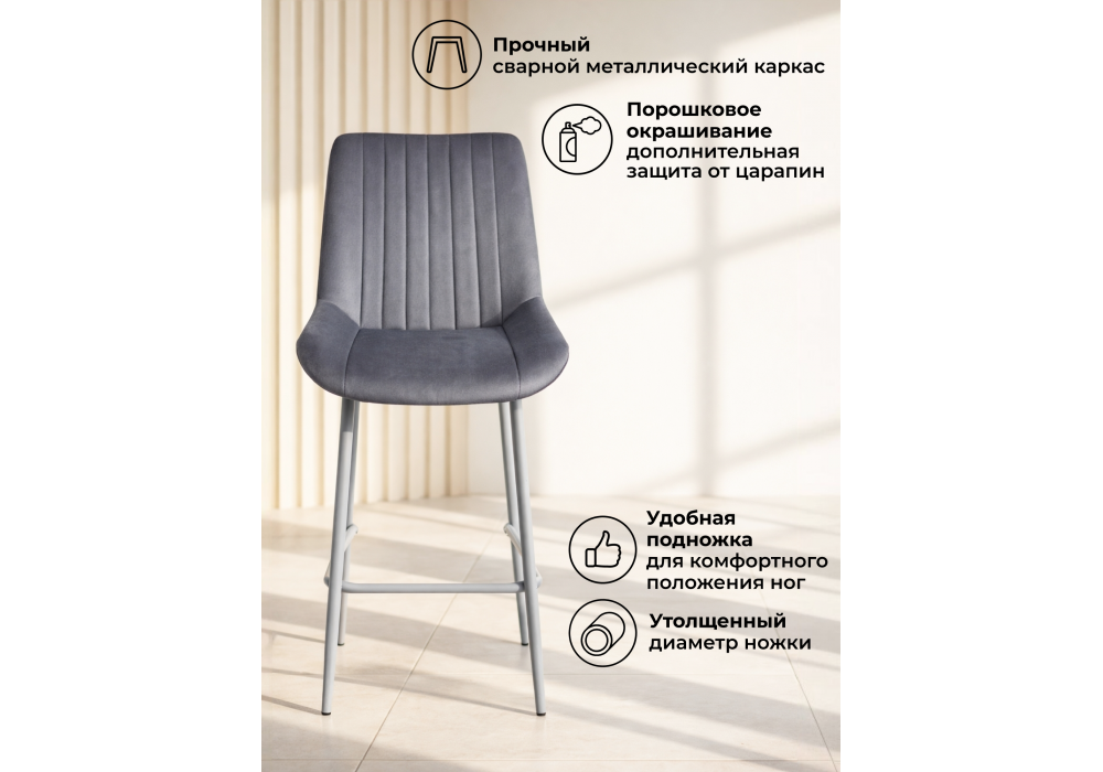 Материал каркаса - металл; Материал сиденья - велюр; Материал обивки - велюр; Цвет ножек - серый; Ширина - 49; Глубина - 57; Высота - 102; Ширина сиденья - 47; Глубина сиденья - 41; Высота сиденья - 63;