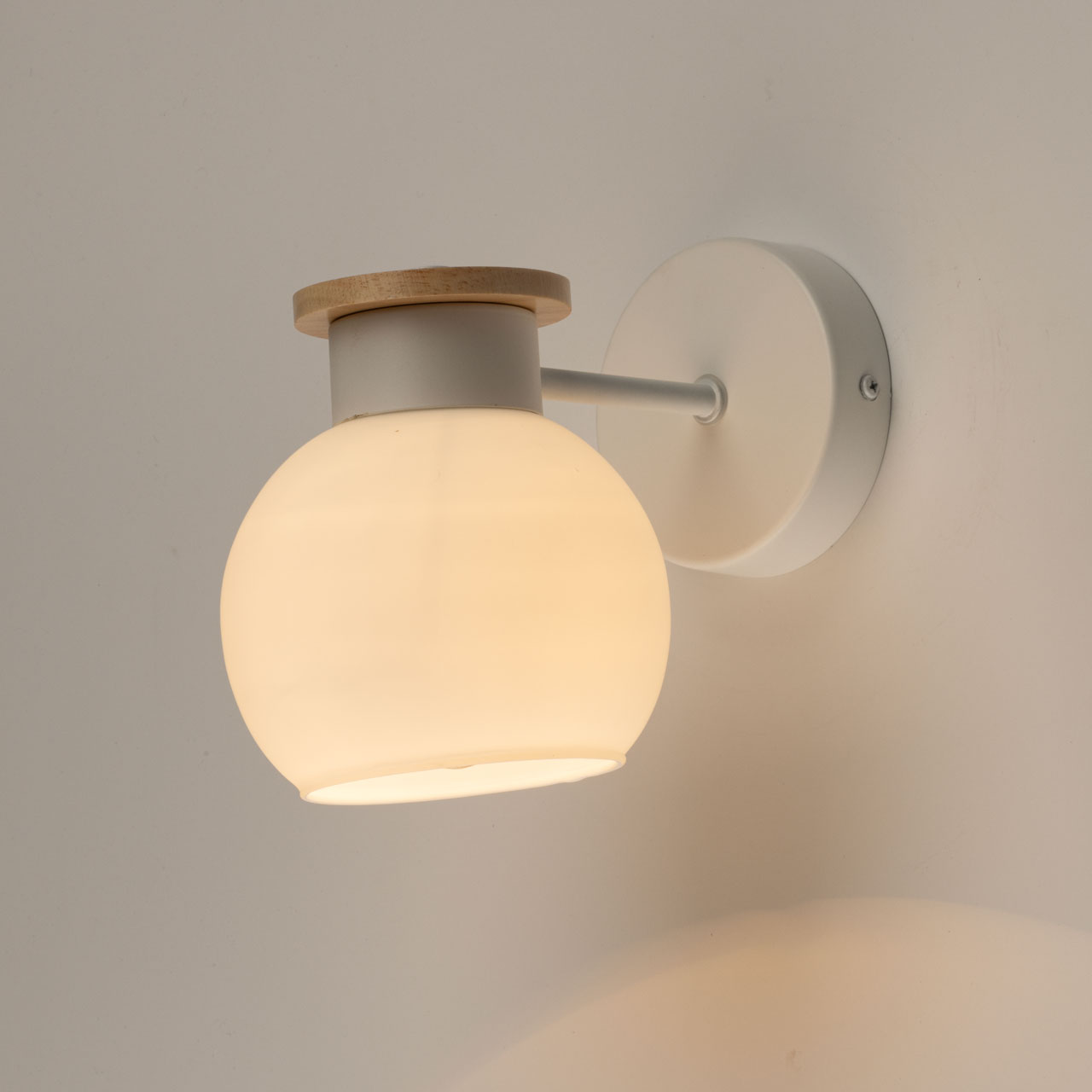 Металлическое основание бра окрашено в белый цвет. Стеклянный плафон отлит в форму и окрашен в белый цвет с внутренней стороны. Светильник декорирован элементом из натурального светлого дерева.