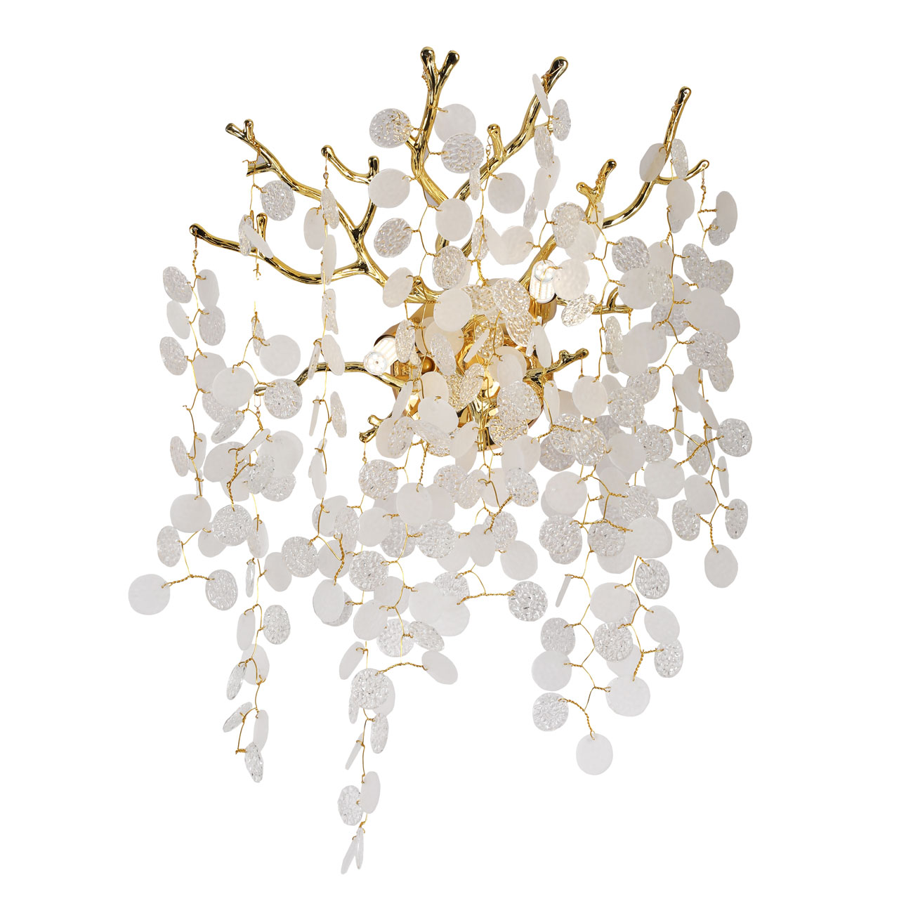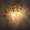 Основание настенного бра выполнено по технологии художественного литья из сплава алюминия с цинком и гальванизировано в цвет золота. Настенное бра декорировано прозрачным фактурным стеклом круглой формы.