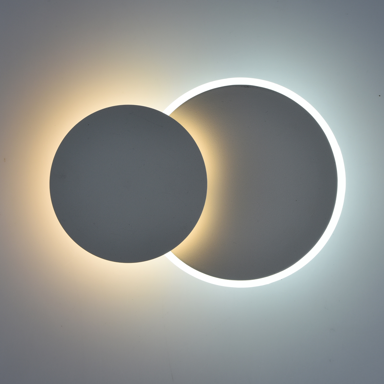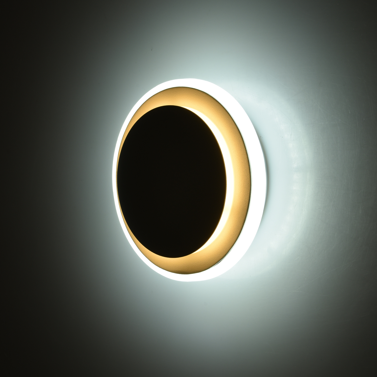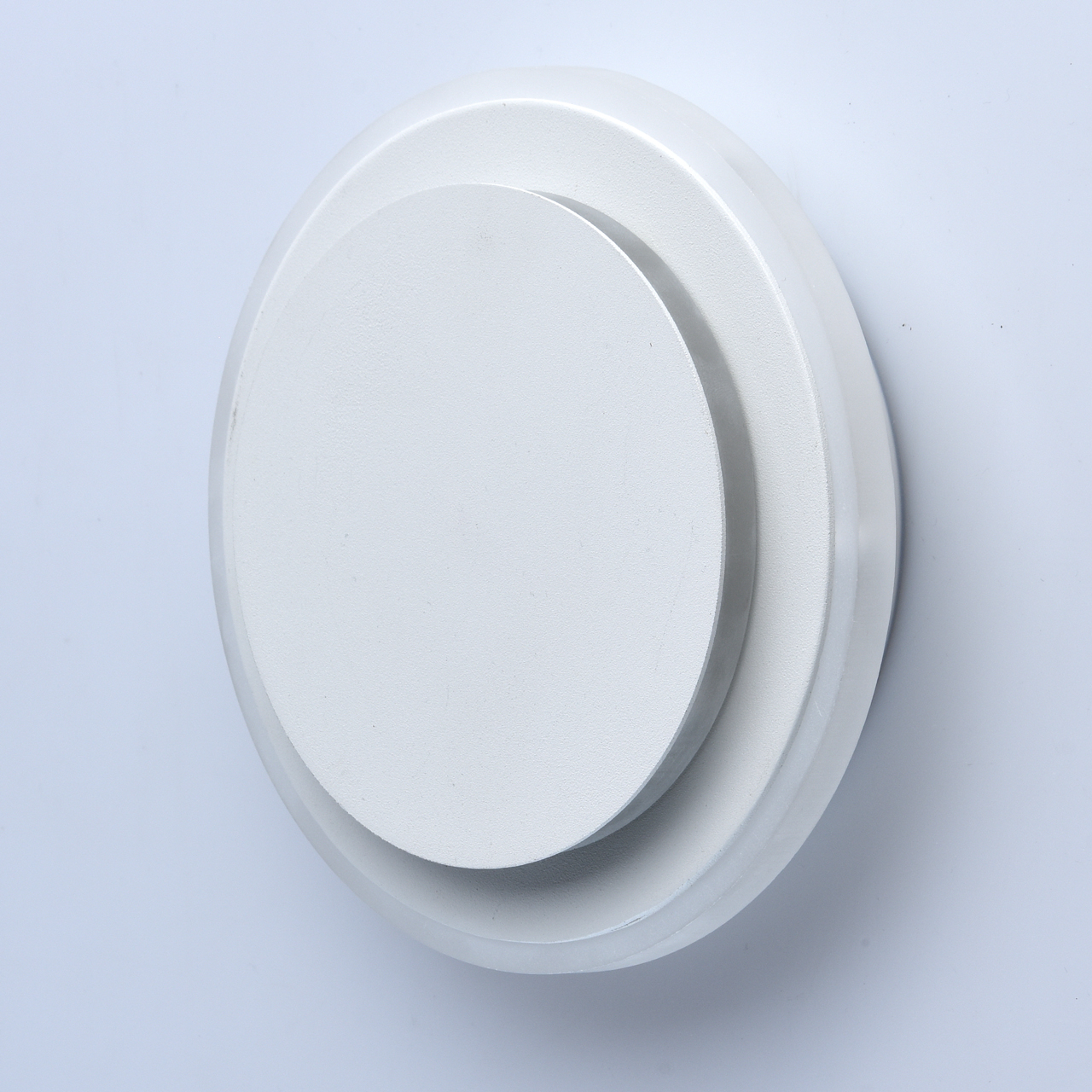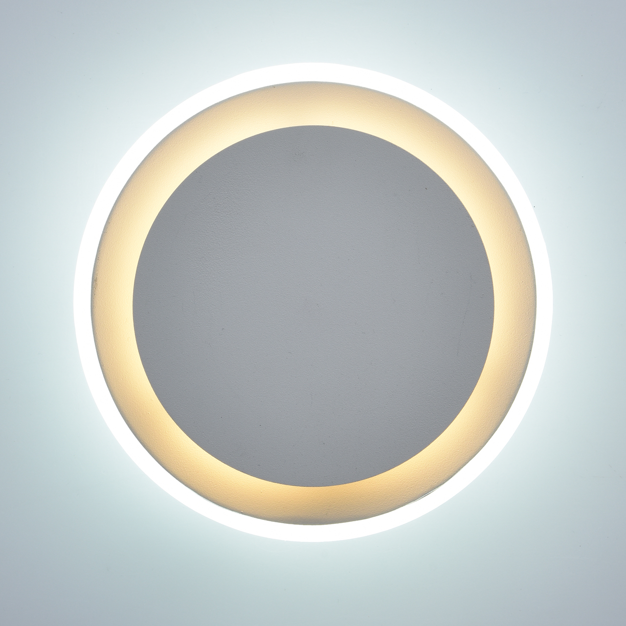 Основание светильника выполнено из комбинации сплавов металлов и обработано по технологии порошкового окрашивания в белый цвет. Корпус светильника выполнен из сплава металла, верхний плафон - из сплава алюминия. Светодиодные источники света типа SMD закрыты матовым акрилом.