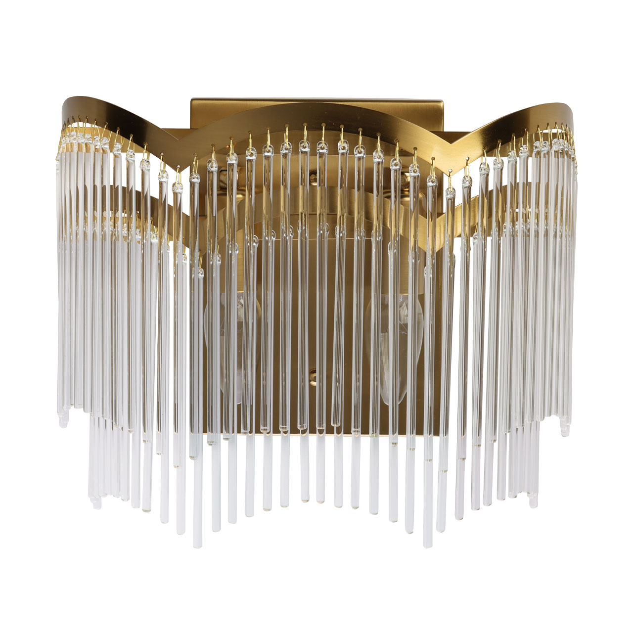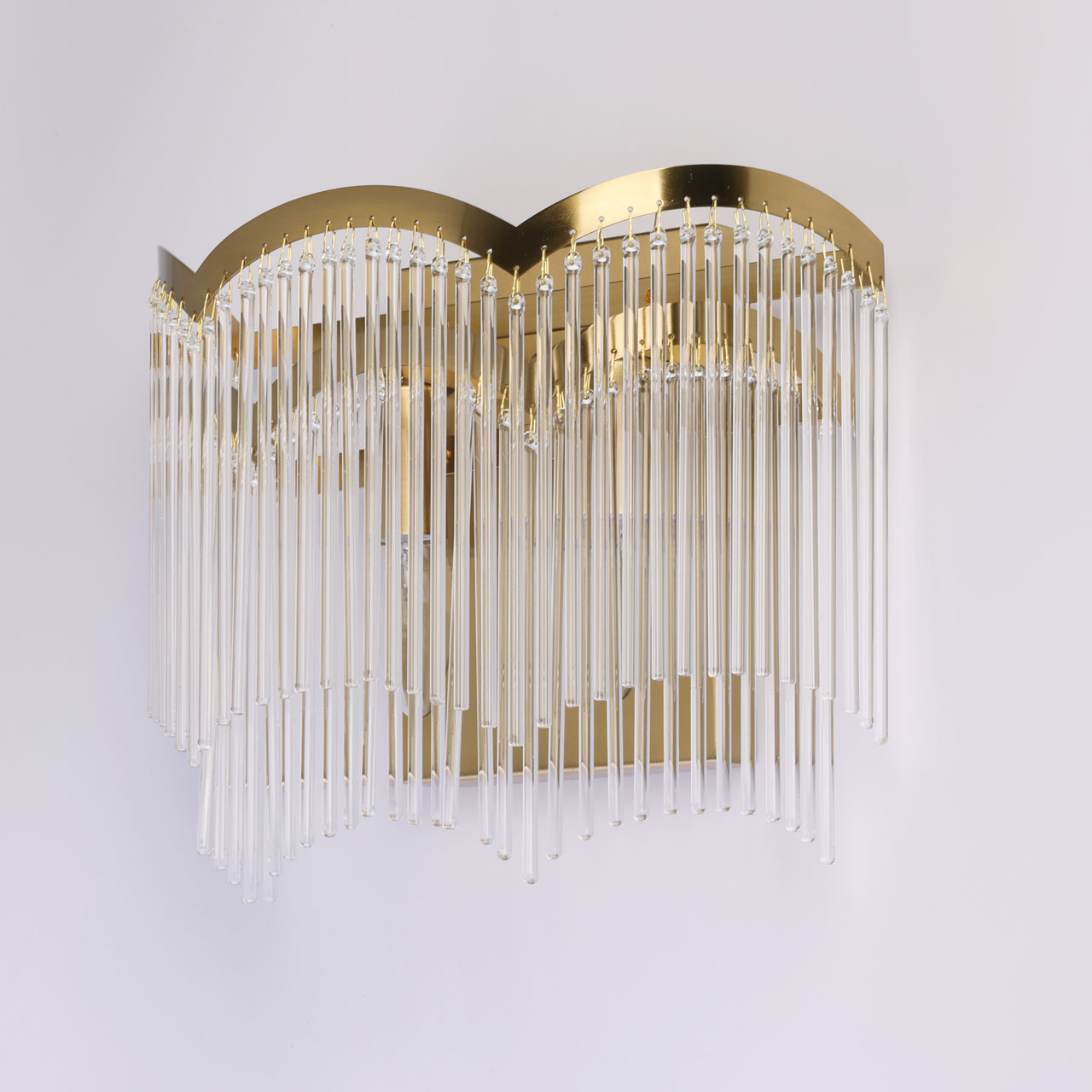 Настенное бра представляет собой каскад стеклянных трубочек, напоминающих струи воды или льдинки. Воздушный облик бра подчеркивает металлическое основание насыщенного латунного цвета. Необычный образ завершается волнистой формой основания в стиле модерн.Заменяемые источники света удобны в эксплуатации.