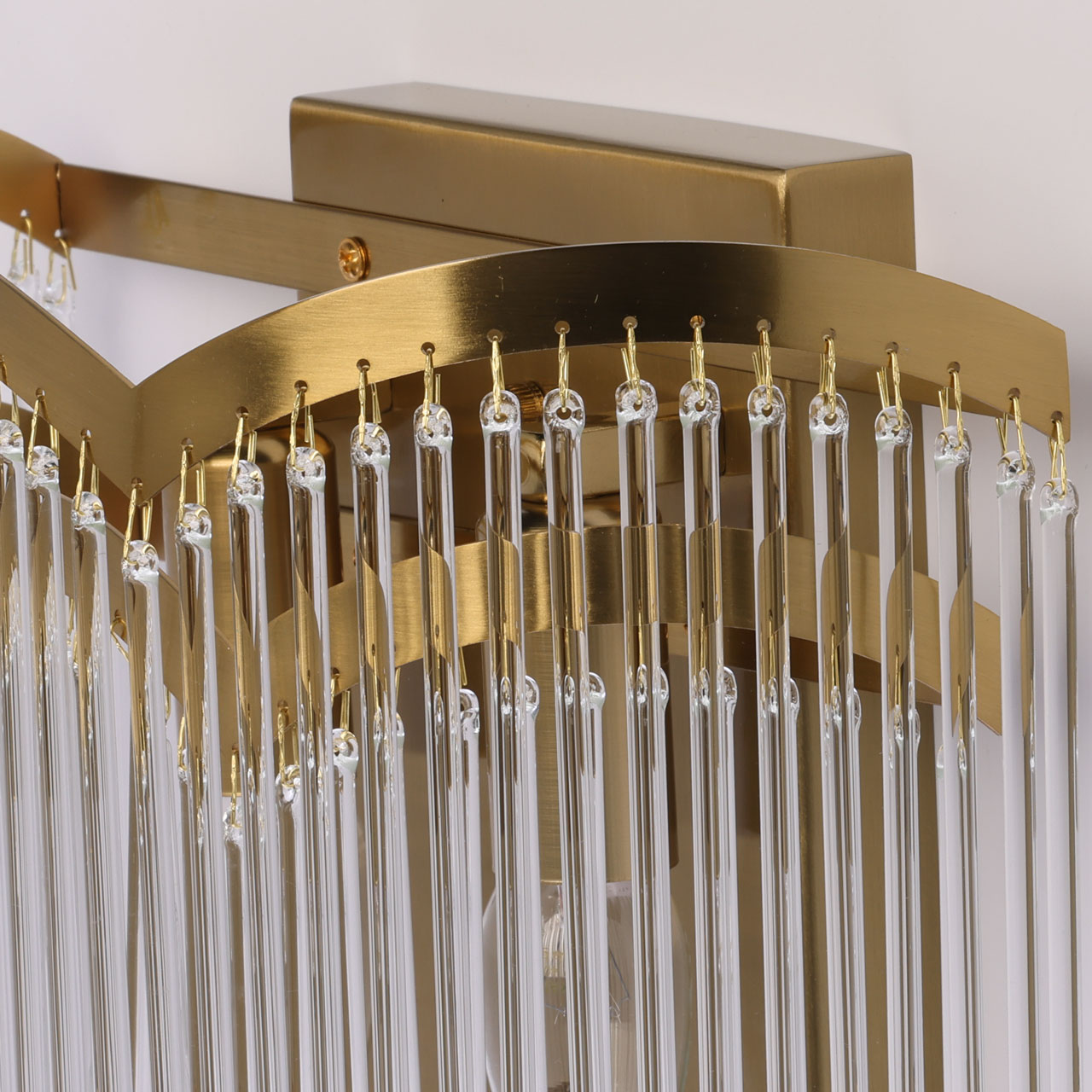 Металлическое основание настенного бра гальванизировано в цвет латуни. Горизонтальное бра декорировано прозрачными стеклянными трубочками.