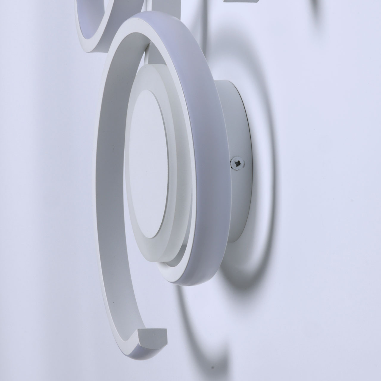Металлическое основание потолочной люстры окрашено в белый цвет. Корпус плафона выполнен из сплава алюминия и окрашен в цвет основания. Светодиодные источники света закрыты белым силиконом и матовым акрилом.