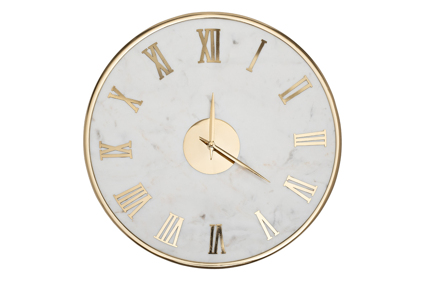Круглые настенные часы из белого мрамора с золотым обрамлением станут стильным акцентом в интерьере гостиной, кабинета или столовой. Благородная фактура камня, лаконичный дизайн, римские цифры цвета золота создают ощущение роскоши и респектабельности. Час...