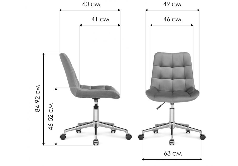Диаметр крестовины: 63 см. Материал каркаса - металл; Материал сиденья - велюр; Материал обивки - велюр; Ширина - 49; Глубина - 60; Высота - 84; Ширина сиденья - 46; Глубина сиденья - 41; Высота сиденья - 46; Высота спинки - 38; Высота максимальная - 92;
