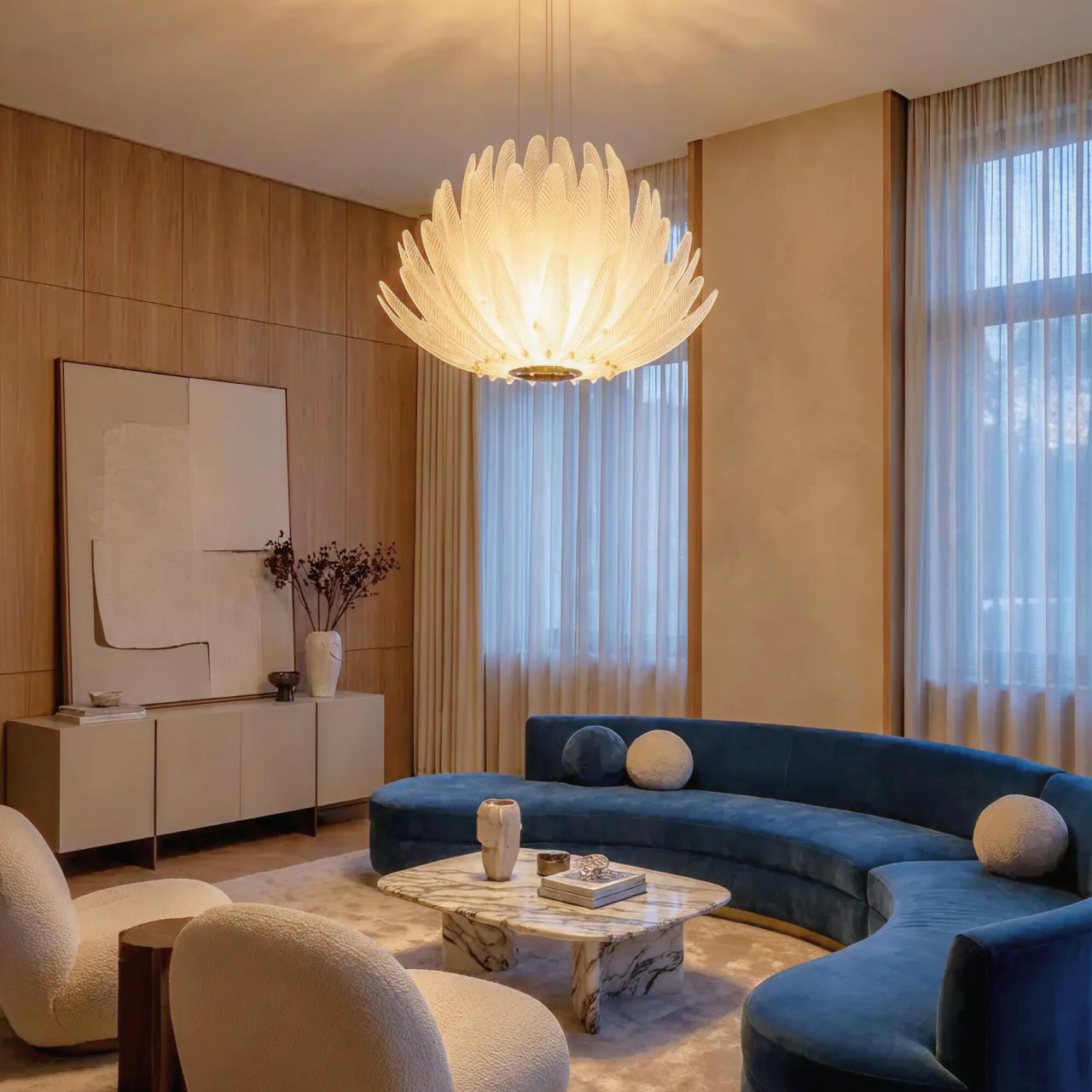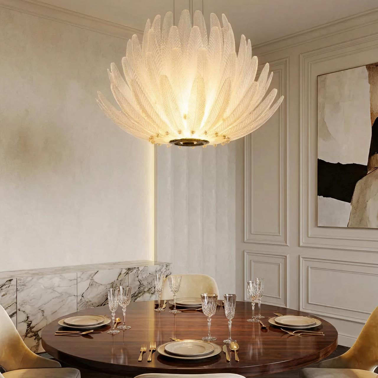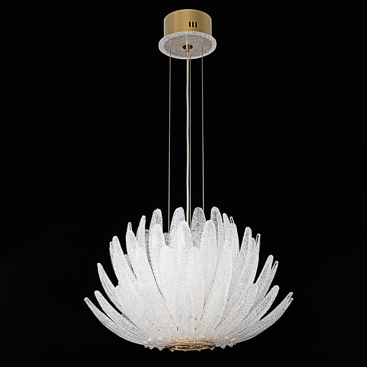 Металлический каркас имеет благородный золотой оттенок, рассеивателем служат несколько рядов полупрозрачных стеклянных текстурных элементов в форме продолговатых листьев. Источником света являются встроенные светодиоды с цветовой температурой 3000К, что соответствует теплому освещению.