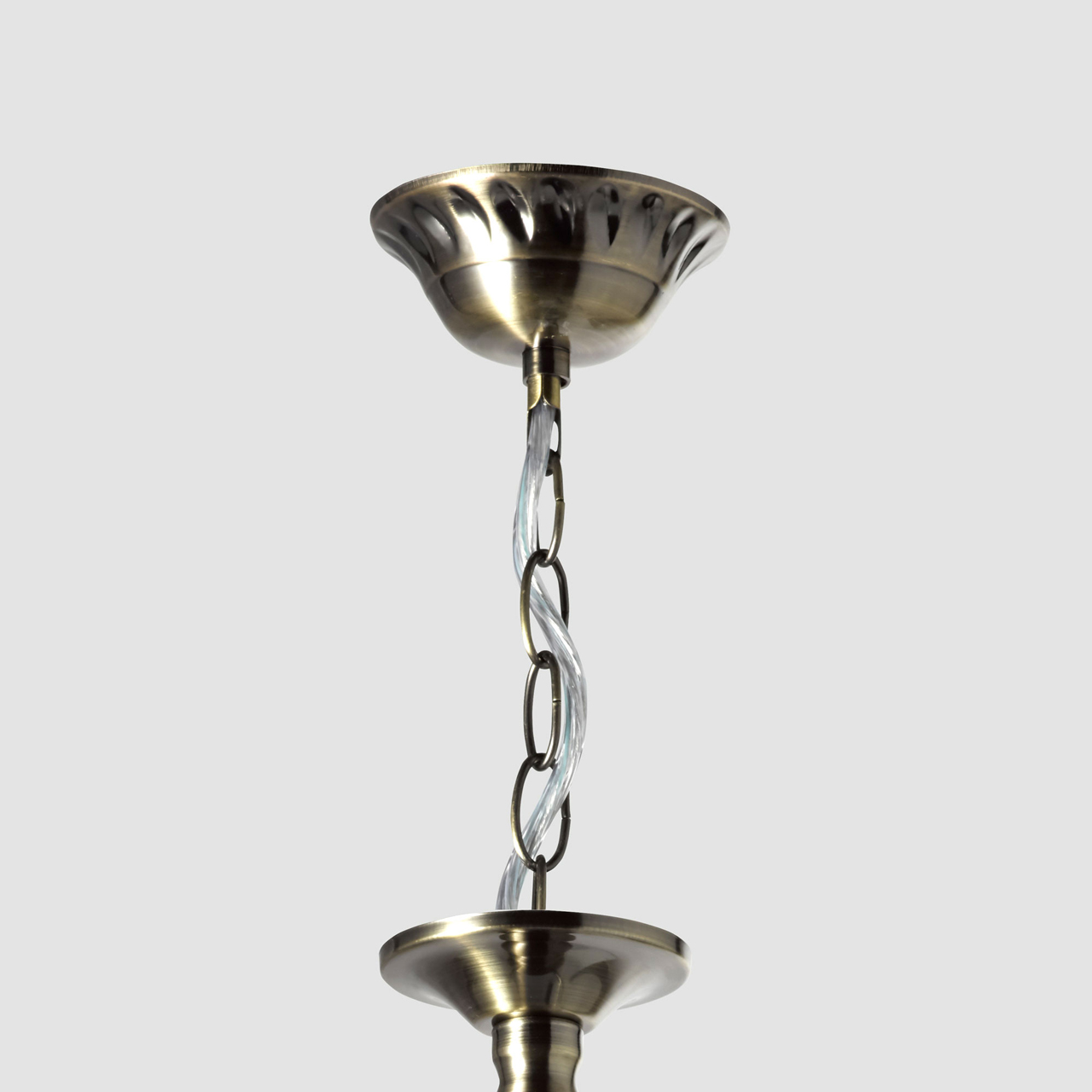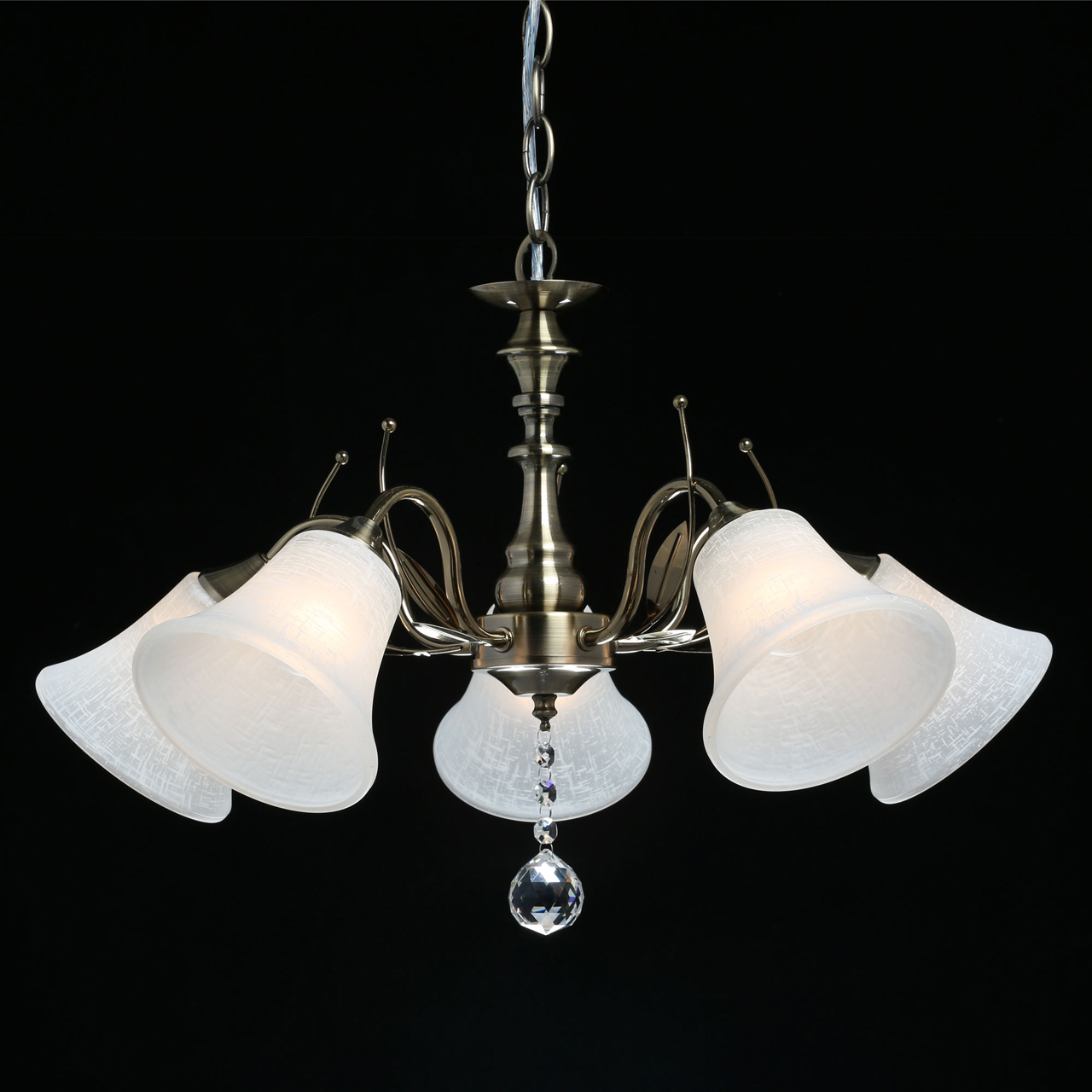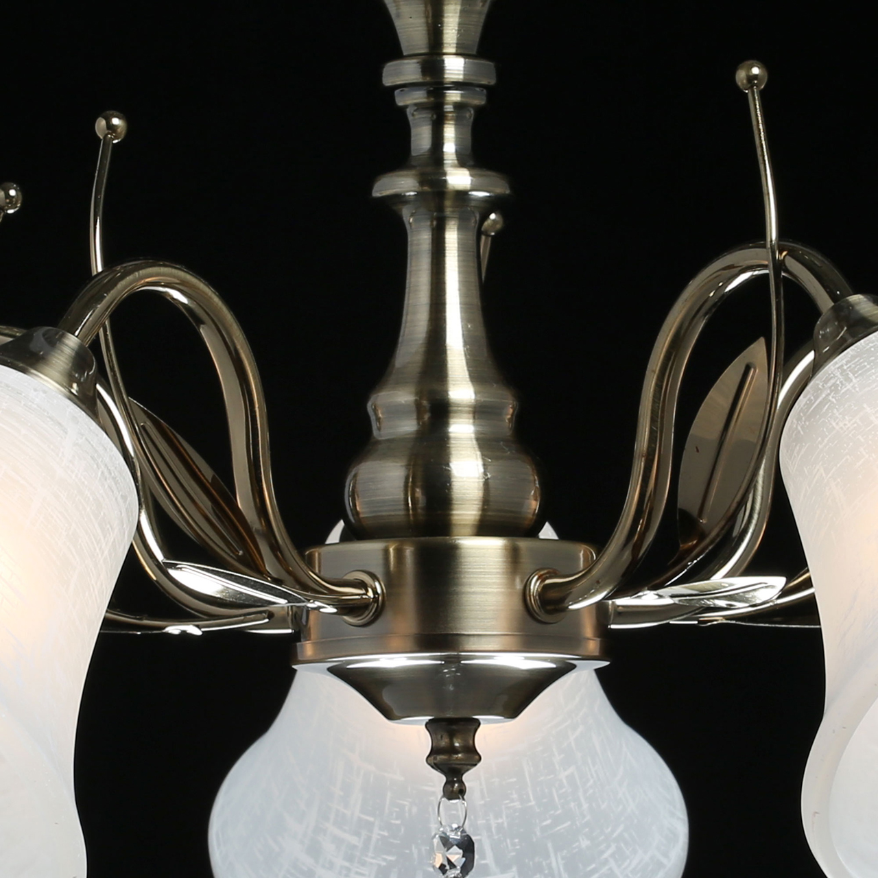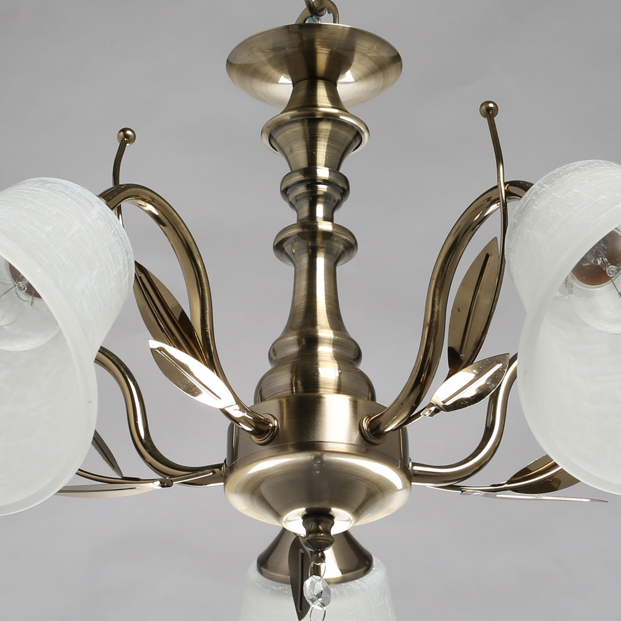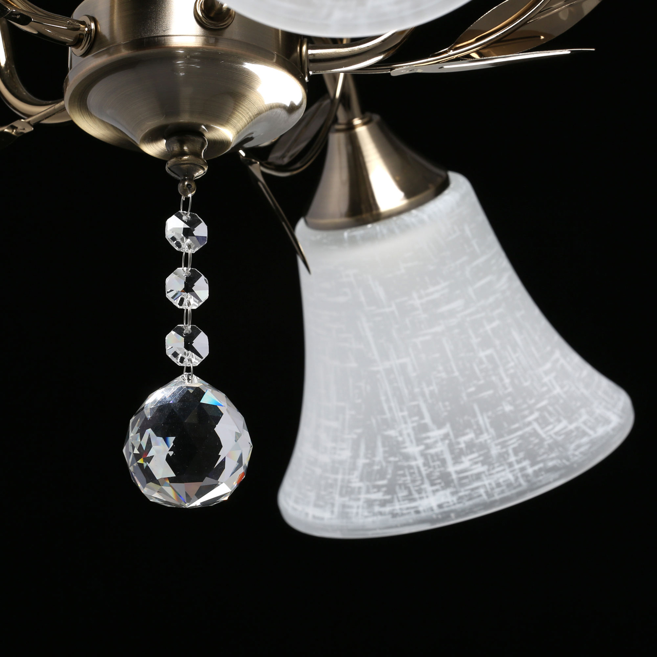 Основание светильника выполнено из металла и гальванизировано в цвет античной бронзы с последующим лакированием. Стеклянные плафоны отлиты в форму и матированы. Светильник декорирован подвесом из хрусталя в форме шара.