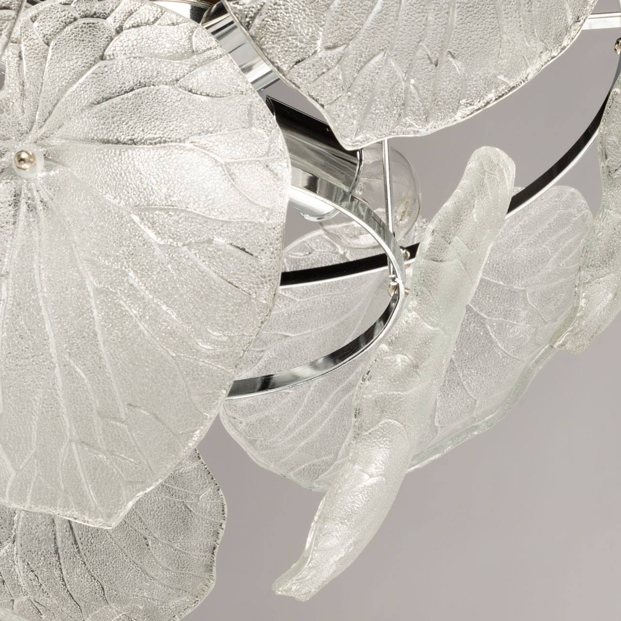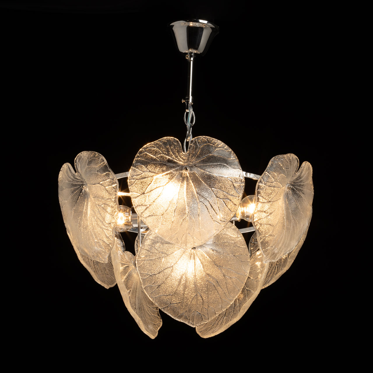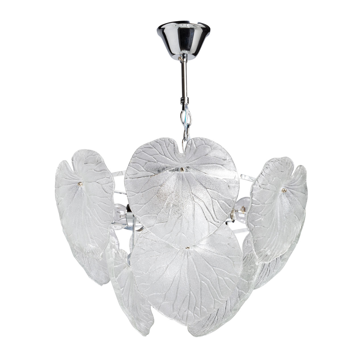 Металлическое основание подвесной люстры гальванизировано в цвет хрома. Светильник декорирован стеклянными фактурными пластинами в форме крупных листьев.