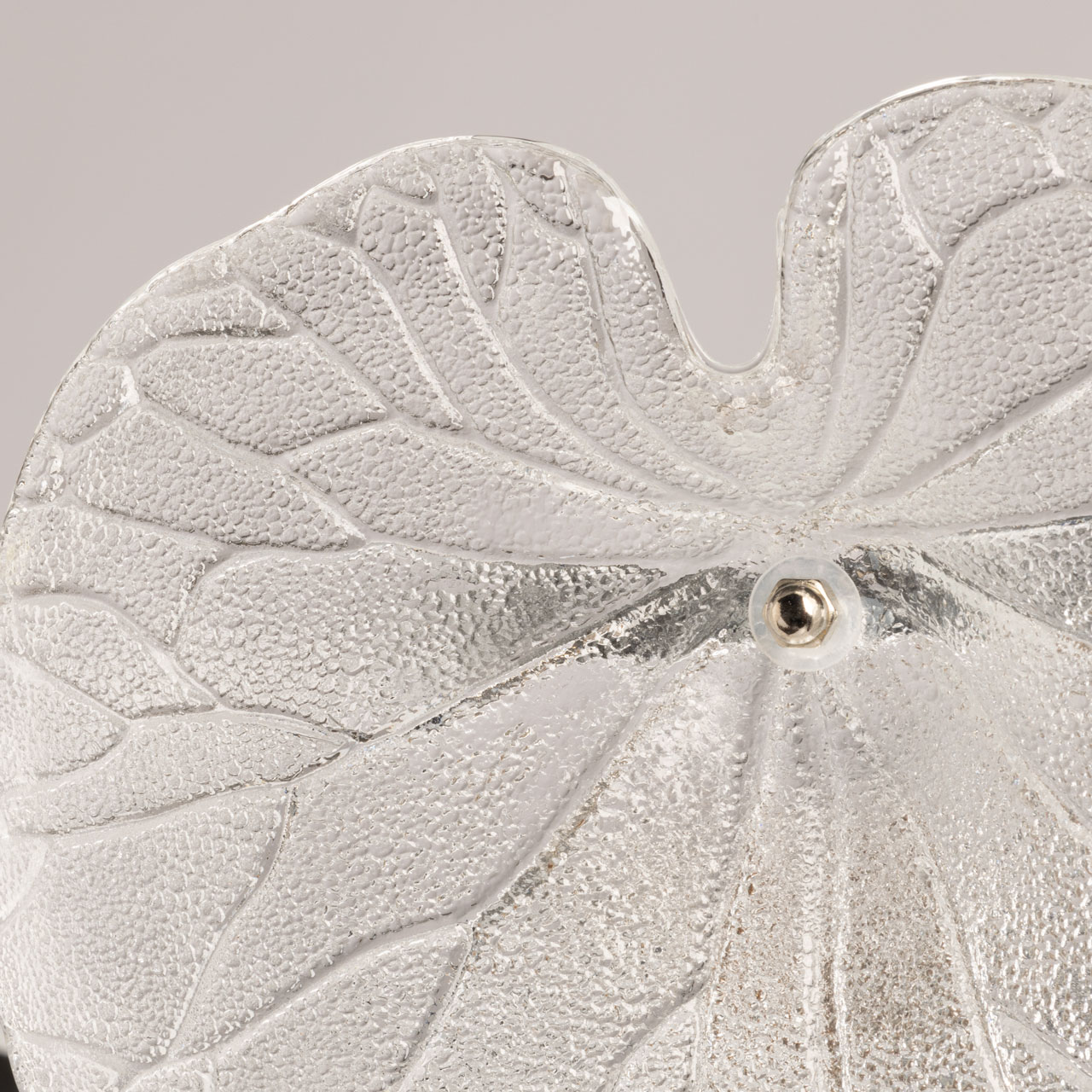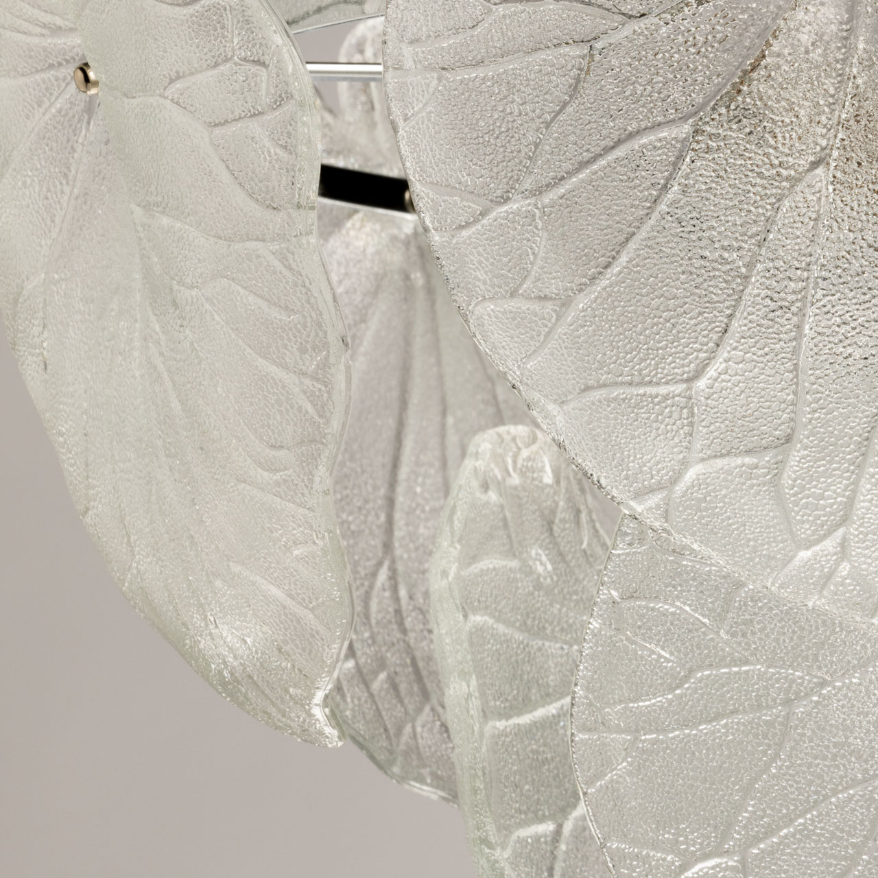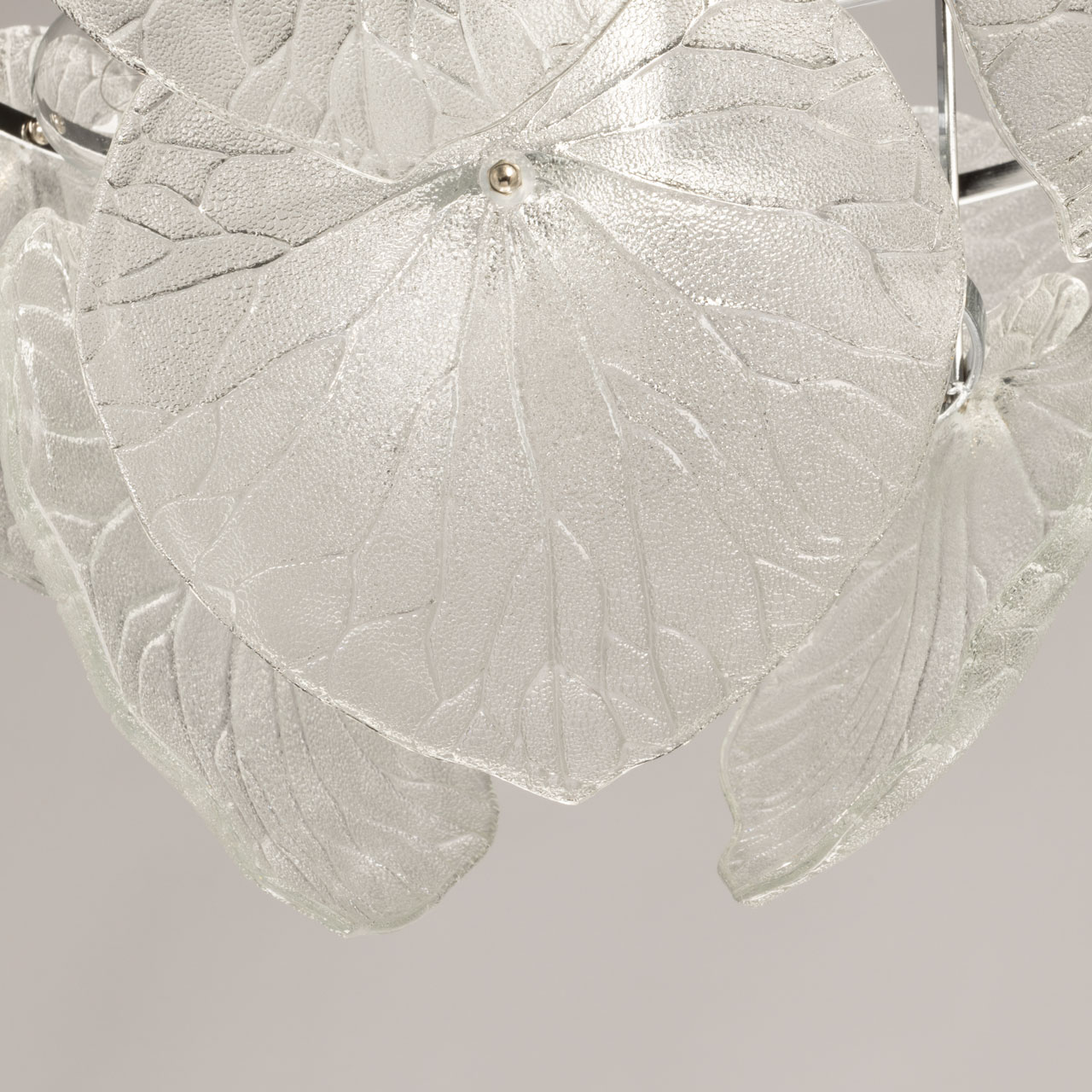Металлическое основание подвесной люстры гальванизировано в цвет хрома. Светильник декорирован стеклянными фактурными пластинами в форме крупных листьев.