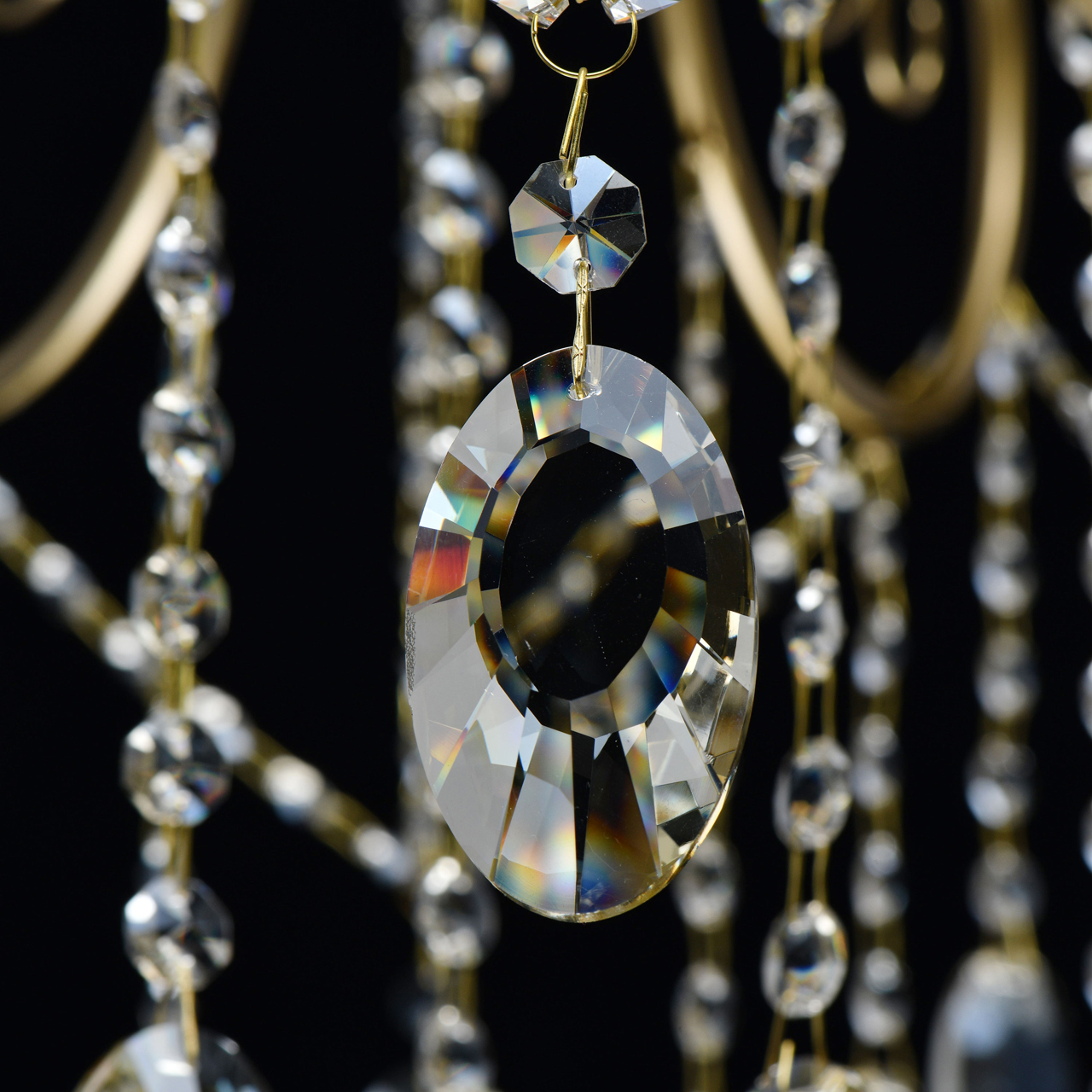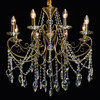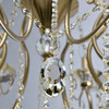 Основание светильника выполнено из металла и гальванизировано в цвет бронзы. Светильник декорирован массивом хрусталя и хрустальными подвесками цвета шампань.