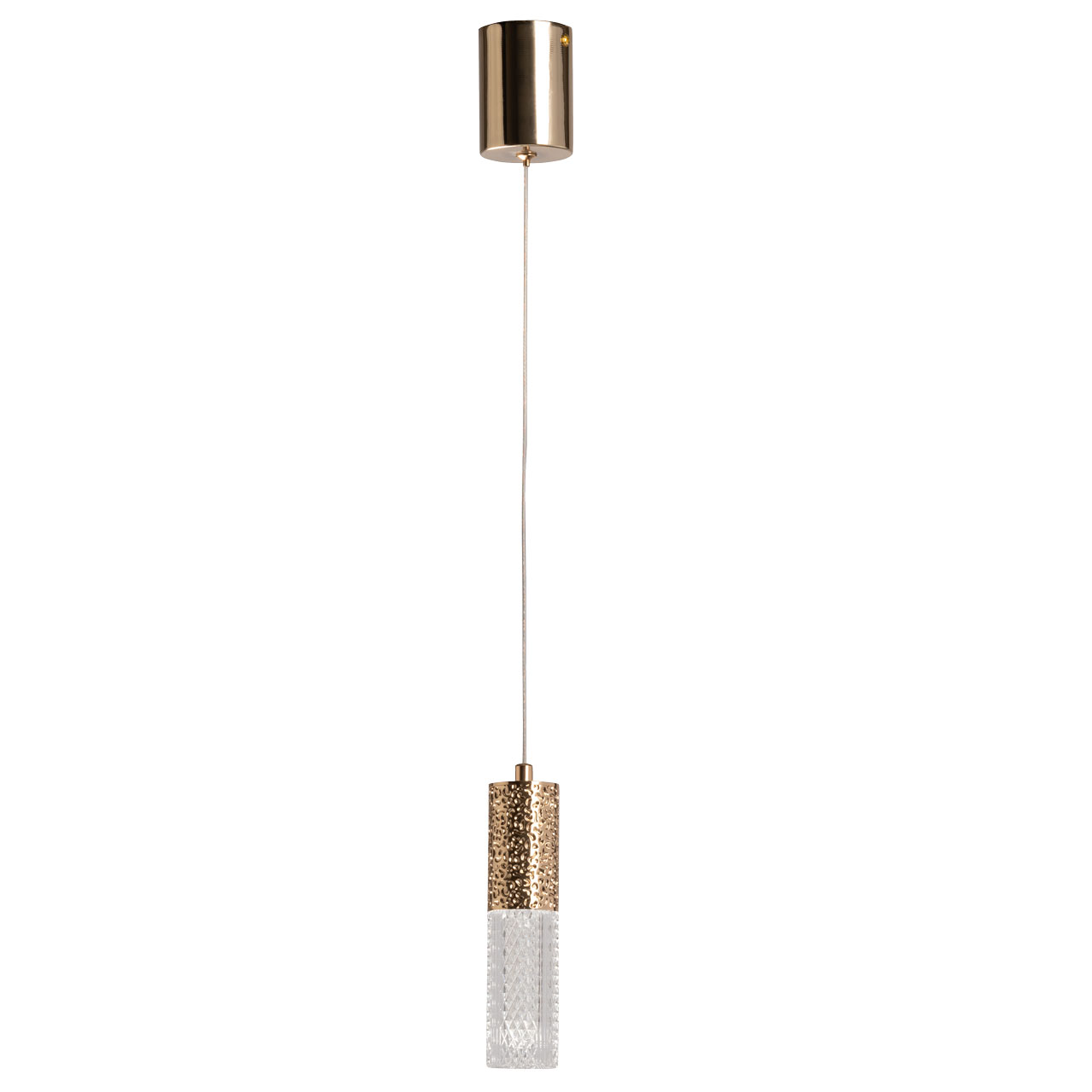 Металлическая потолочная чаша подвеса гальванизирована в цвет французского золота. Корпус плафона в виде цилиндра выполнен из сплава алюминия с цинком и гальванизирован в цвет основания. Светодиодный источник света закрыт прозрачным фактурным акрилом.