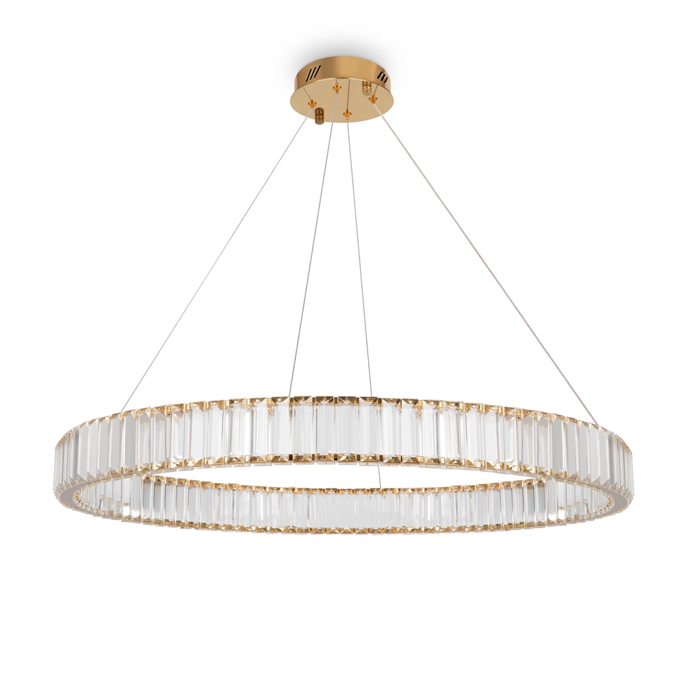 Металлическая арматура в цвете латунь и хром. Хрустальные декоративные кольца с геометричными гранями. LED-источник света. Регулировка цветовой температуры (3000-4000-5000K) и яркости 4G-dimming при помощи пульта (в комплекте).