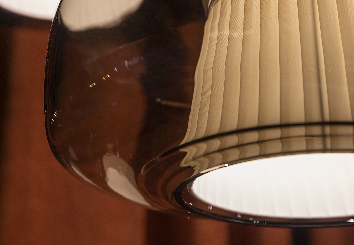 Подвесной светильник Vistosi Plisse SP G Amber с арматурой матового бронзового цвета. Выдувное стекло диффузора дымчатого цвета скрывает внутренний тканевый абажур и дает жизнь игре прозрачности, цветов и текстур, которые делают Plissè элегантным элементом, способным охарактеризовать и придать индивидуальность помещению, в котором он находится.