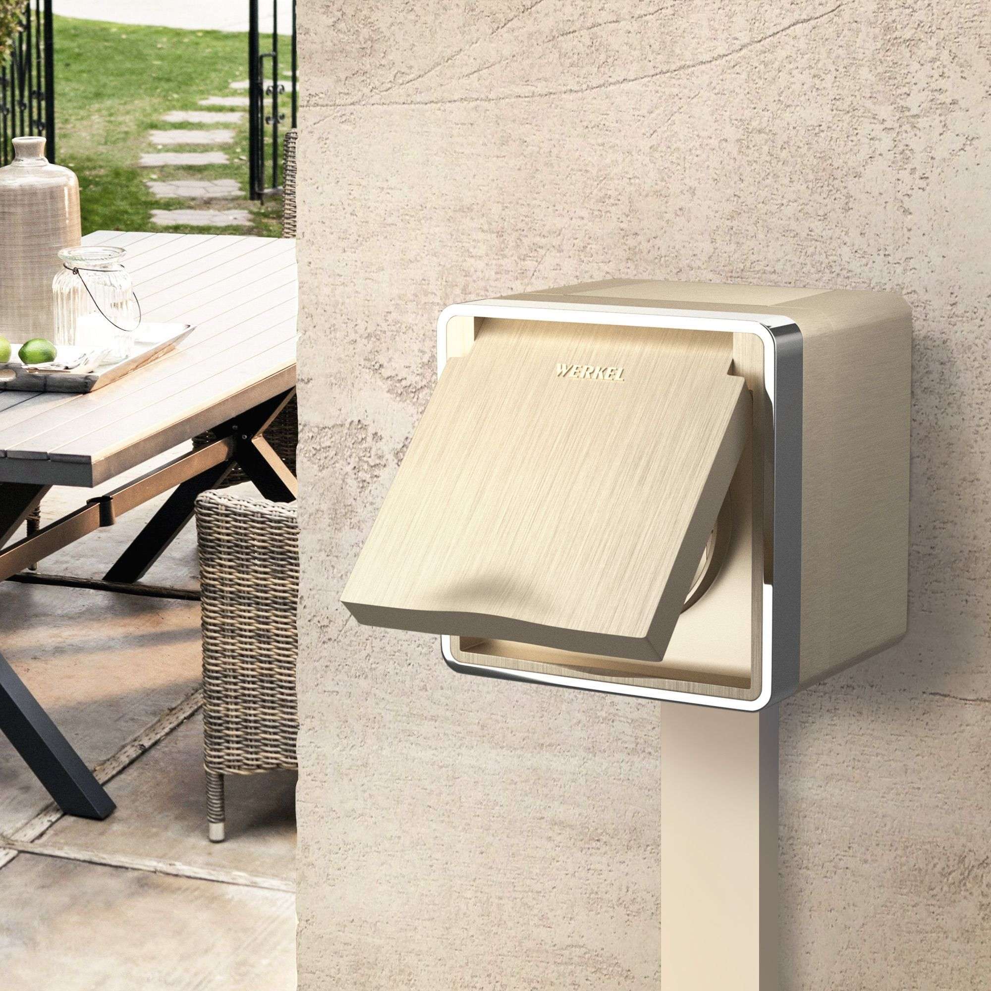 Купить "Розетка влагозащищенок с зазем с защитной крышкой и шторками Werkel Gallant шампань рифленый W5071210"