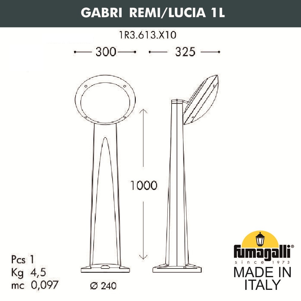 Садовый светильник-столбик FUMAGALLI серии LUCIA - модель FUMAGALLI GABRI REMI/LUCIA 1L. Устанавливаются как садово-парковые, уличные, ландшафтные светильники для освещения парковых дорожек, тротуаров, газонов, коттеджных, садовых участков, придомовых территорий, ландшафтного дизайна - там, где требуется основное или дизайнерское освещение. Одна из особенностей уличных светильников GABRI REMI/ LUCIA - в возможности комплектации уникальной задней подсветкой Ambilight - задней стенкой из цветного или светопрозрачного акрила. При включении такой светильник высвечивает позади себя декоративное световое пятно, которое может иметь разные цвет. Также, светильники этой серии могут быть на небольших настенных кронштейнах модель REMI/LUCIA, и настенным -потолочным светильником "тарелкой" LUCIA. Корпус изготовлен из современного вандалостойкого полимера RESIN по уникальной технологии "FUMAGALLI". Прочного, окрашенного в массе, не ржавеющего и не выгорающего на солнце. Все светильники пыле-влаго защищены по стандарту IP55 (Пылезащищенные, защита от водяных струй с любого направления). Рассеиватель выполнен из антивандального, не мутнеющего и не горючего PMMA. Срок службы светильника - не менее 20 лет. Температура использования от -60 до +90. При заказе требуется выбрать цвет корпуса, цвет подсветки.