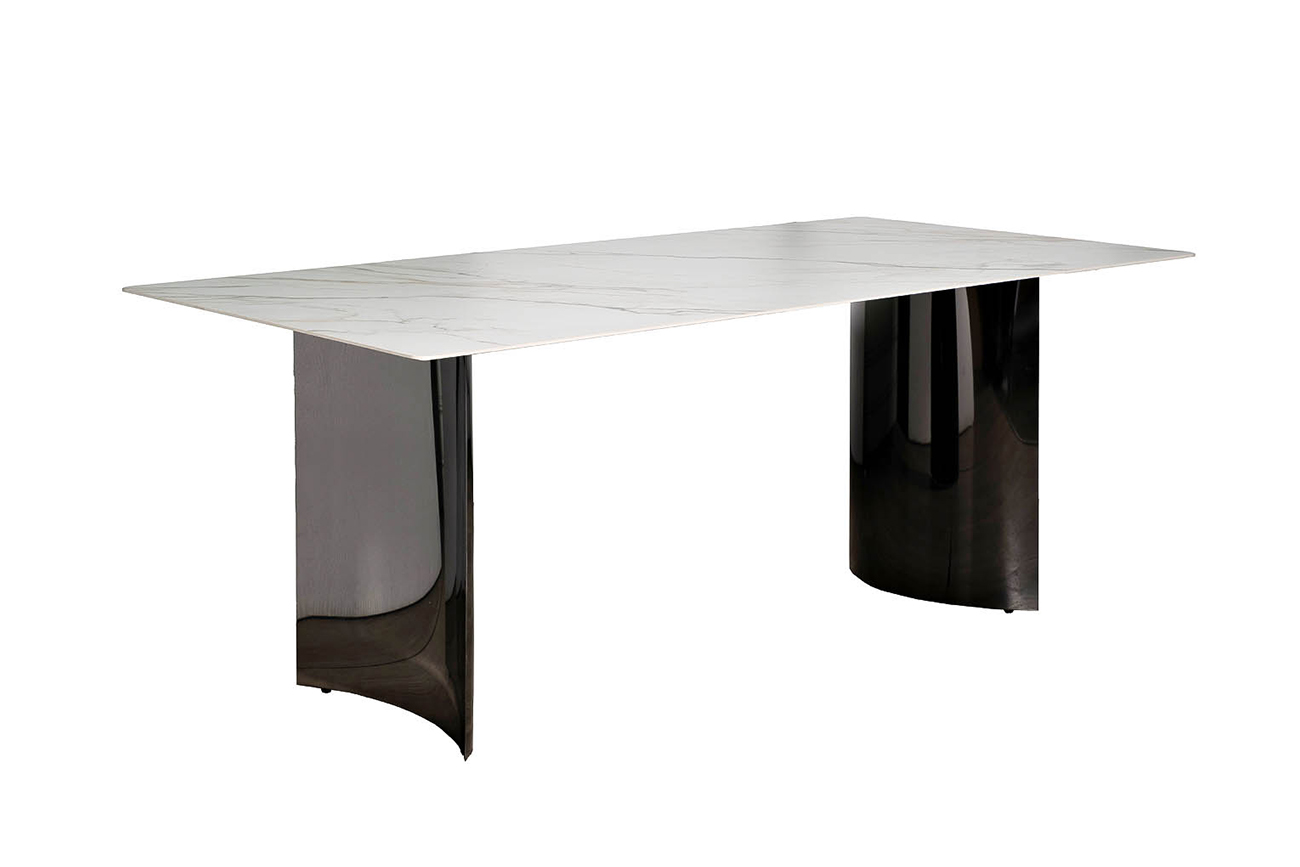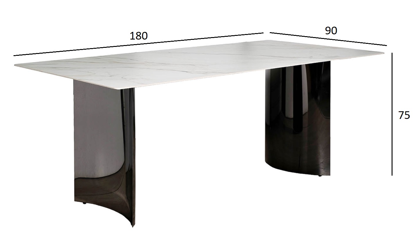 Столешница изготовлена из прессованного при высокой температуре и давлении керамогранита с мраморным узором, и обладает высокими характеристиками износостойкости, что является несомненным преимуществом для обеденного стола. Опоры, вогнутые внутрь, имеют глянцевое покрытие с эффектом черного зеркала. Стильный обеденный стол из керамогранита – эффектная мебель для современной столовой или просторной кухни, где на первое место ставится стиль и элегантность обстановки. Дизайн сочетает в себе белую столешницу и черное основание – классика вне времени и моды. Дизайнерский обеденный стол для столовой выполнен из первоклассных материалов. Все в этой мебели говорит о высоком статусе и безупречном вкусе. Garda Decor предлагает купить современный обеденный стол, а также стулья или кресла, которые дополнят его и составят достойную компанию.