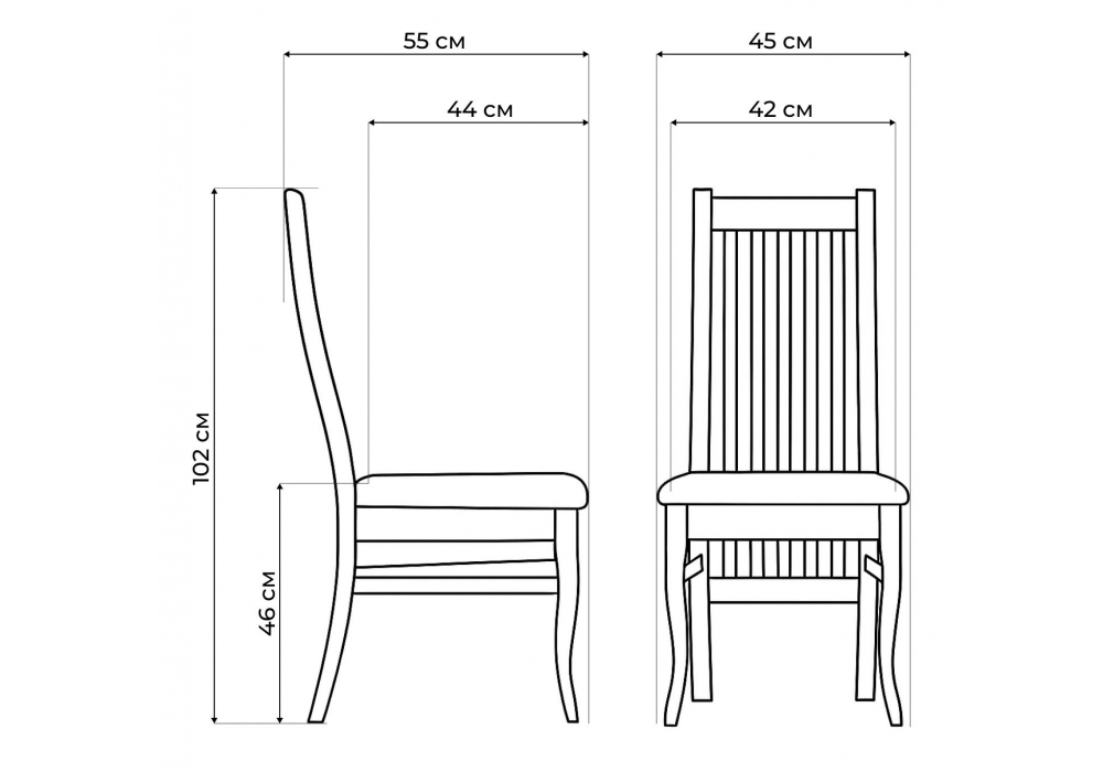 Материал каркаса - массив дерева; Материал сиденья - ткань; Материал обивки - ткань; Ширина - 45; Глубина - 55; Высота - 102; Ширина сиденья - 42; Глубина сиденья - 44; Высота сиденья - 46;