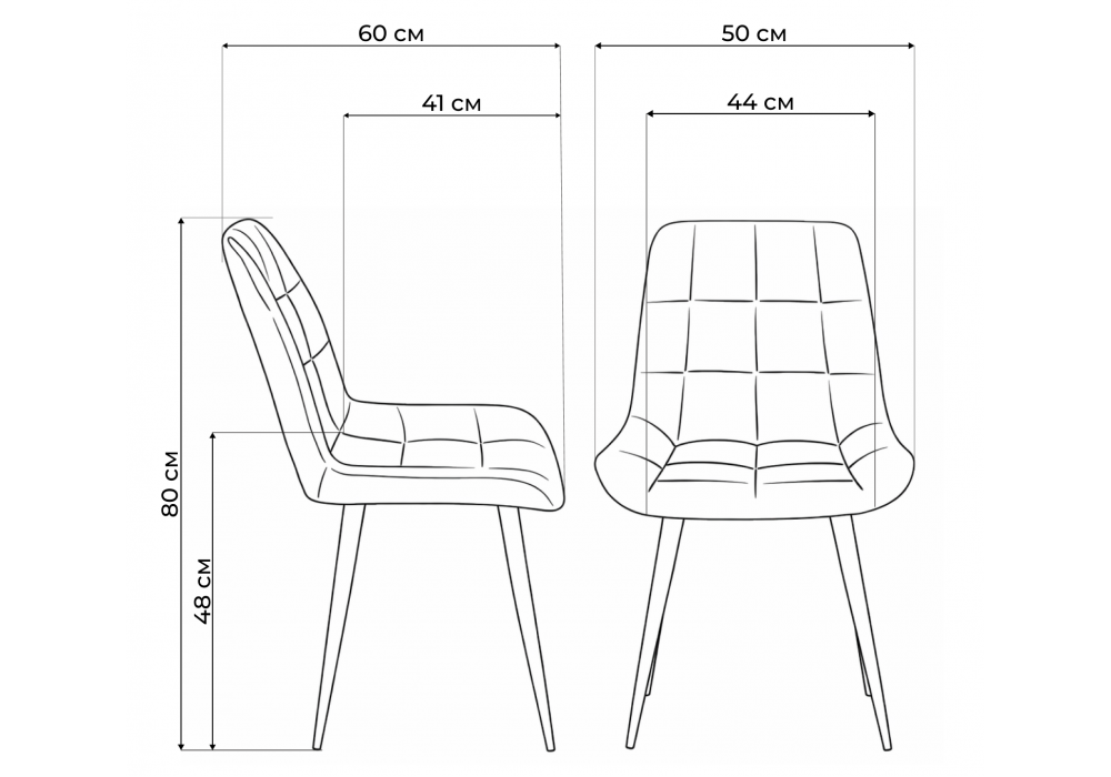 Материал каркаса - металл; Материал сиденья - велюр; Материал обивки - велюр; Цвет ножек - черный; Ширина - 50; Глубина - 60; Высота - 80; Ширина сиденья - 44; Глубина сиденья - 41; Высота сиденья - 48;