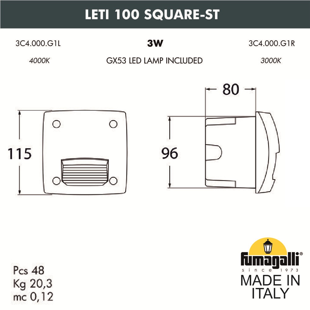 Светильник для подсветки лестниц встраиваемый FUMAGALLI серии LETI, модель LETI 100 Square-ST - изготовлен в Италии. Основное назначение - мягкое, акцентное освещение небольших площадей, световой дизайн, ландшафтная подсветка. Отлично подходит для освещения лестничных маршей, коридоров, подпорных стенок, ландшафтного освещения. Устанавливается в вертикальные поверхности, например в стены, колонны, откосы ступеней. В поверхность монтируется и закрепляется закладной элемент "стакан", в который выводится электрический провод. Далее, в эту деталь устанавливается сам уличный светильник LETI и подключается электропитание. Корпус изготовлен из современного вандалостойкого, негорючего полимера RESIN не требующего окраски. Прочного, окрашенного в массе, не ржавеющего и не выгорающего на солнце. Все светильники пыле-влаго защищены по стандарту IP66. Корпус ландшафтного светильника не проводит электричество, относится к 2 классу электробезопасности. Рассеиватель выполнен из антивандального, не мутнеющего и не горючего PMMA. Срок службы светильника - не менее 20 лет. Не требуется трансформатор. Напряжение питания - 220 В. Температура использования от -60 до +90. При заказе требуется выбрать цвет корпуса.