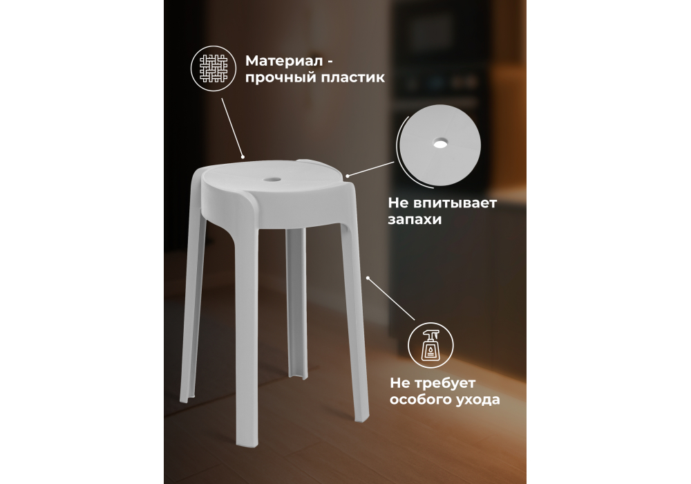 Материал каркаса - пластик; Материал сиденья - пластик; Материал обивки - пластик; Ширина - 28; Глубина - 28; Ширина сиденья - 26; Глубина сиденья - 26; Высота сиденья - 45;